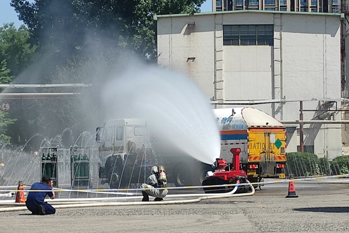 演練從“恐怖分子襲擊液氧槽車沖撞氫氣瓶組”開始,單位立即啟動應(yīng)急預(yù)案,開展初期處置;消防隊開展?;奋囕v著火滅火、氫氣瓶組泄漏處置。演練共設(shè)企業(yè)自救、處置移交、火場偵察、警戒封控、疏散救人、稀釋驅(qū)散、現(xiàn)場處置、危險轉(zhuǎn)運、全面洗消9項流程。演練中,消防隊共出動消防作戰(zhàn)車輛9輛,消防指戰(zhàn)員52名,北普公司參加應(yīng)急演練人員28名。
