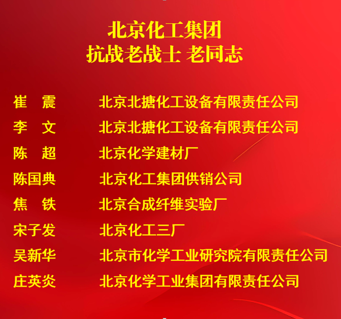 在紀念中國人民抗日戰爭暨世界反法西斯戰爭勝利 80 周年之際,黨中央、國務院、中央軍委為健在的抗戰老戰士、老同志授予“中國人民抗日戰爭勝利 80 周年紀念章”,北京化工集團8位抗戰老戰士、老同志榮獲紀念章。